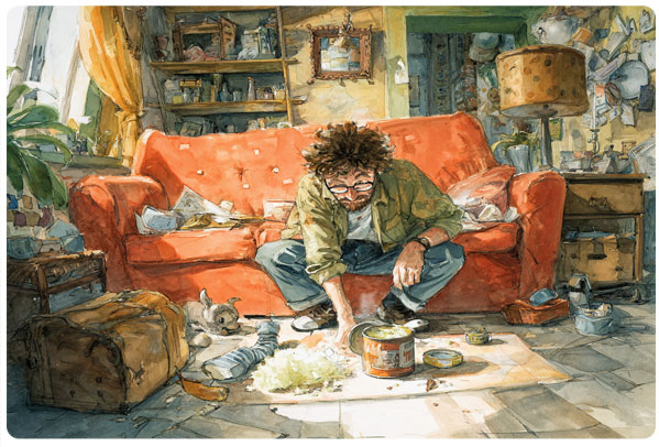 Max begann seinen Tag mit einer Dose Ravioli. Doch als er den Dosenöffner ansetzte, rutschte er ab, und die Konservendose fiel klappernd vom Tisch. Sie rollte in einem kunstvollen Zickzack unter das Sofa, wo sie sich in einem verschachtelten Labyrinth aus vergessenen Socken und eine Menge Staubflusen verirrte.
