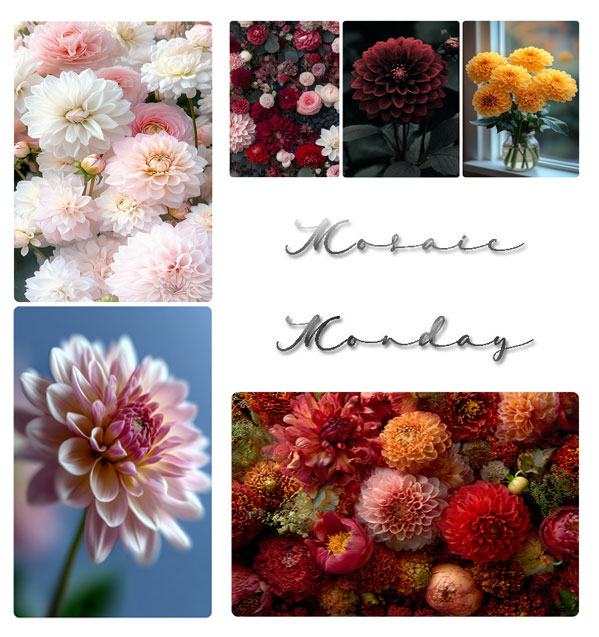 Heute ist mein Mosaik mit Dahlien gefüllt. Die Dahlie ist eine Blume, die keine halben Sachen macht. Wenn sie blüht, dann mit voller Hingabe: groß, farbenfroh, üppig, fast ein kleines Feuerwerk im Garten. Man könnte sagen, sie ist die Königin des Spätsommers, die noch einmal alle Farben sammelt, bevor der Herbst die Bühne betritt.