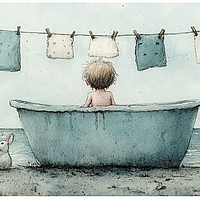 Freddy, der Teddy, wartete tapfer daneben. Sein wuscheliger Bruder hing sogar klatschnass an der Wäscheleine, neben einem Höschen und einem Waschlappen. "Du bist der Nächste", murmelte Emil zu Freddy. Der plüschige Freund schien ein wenig nervös.